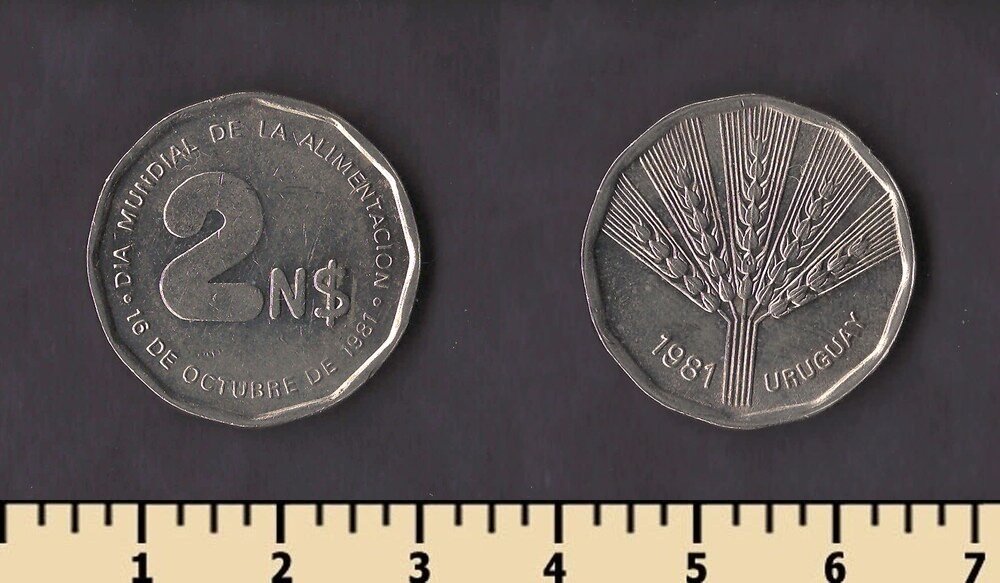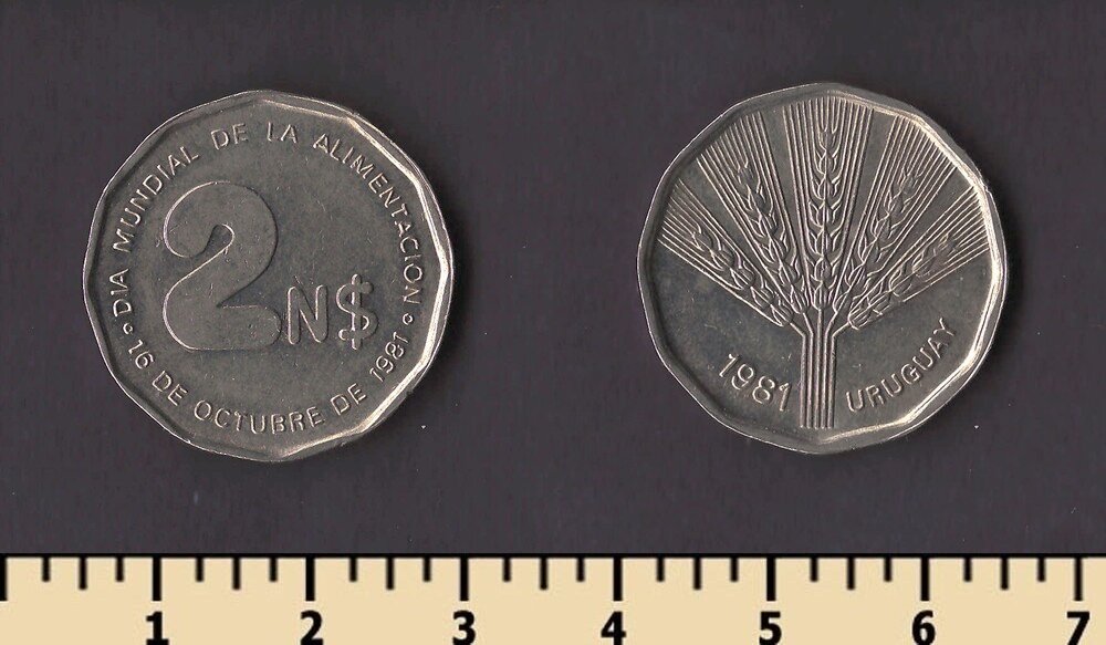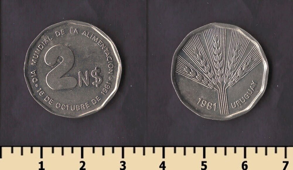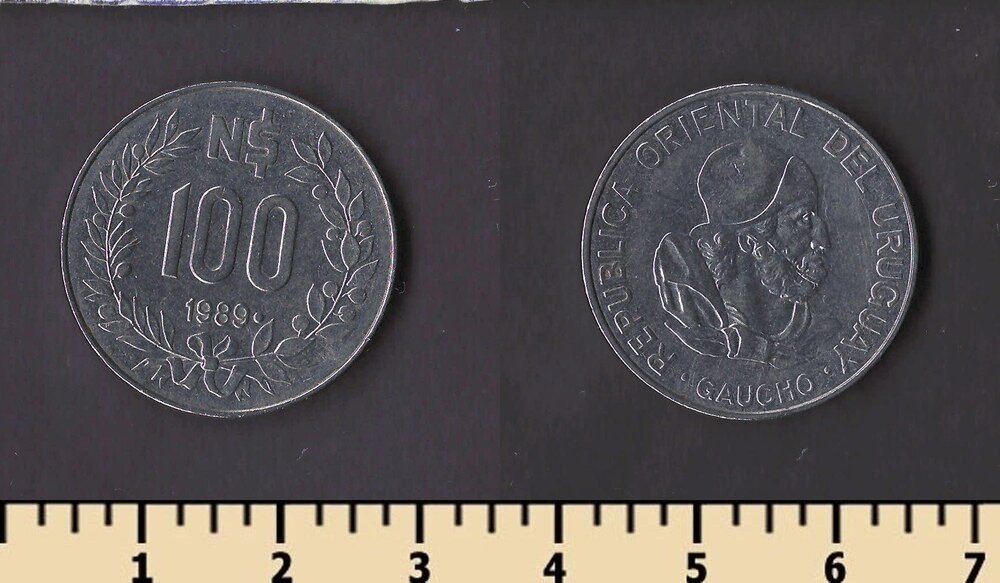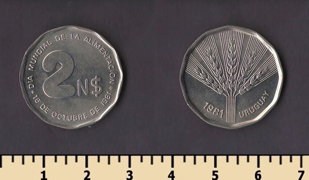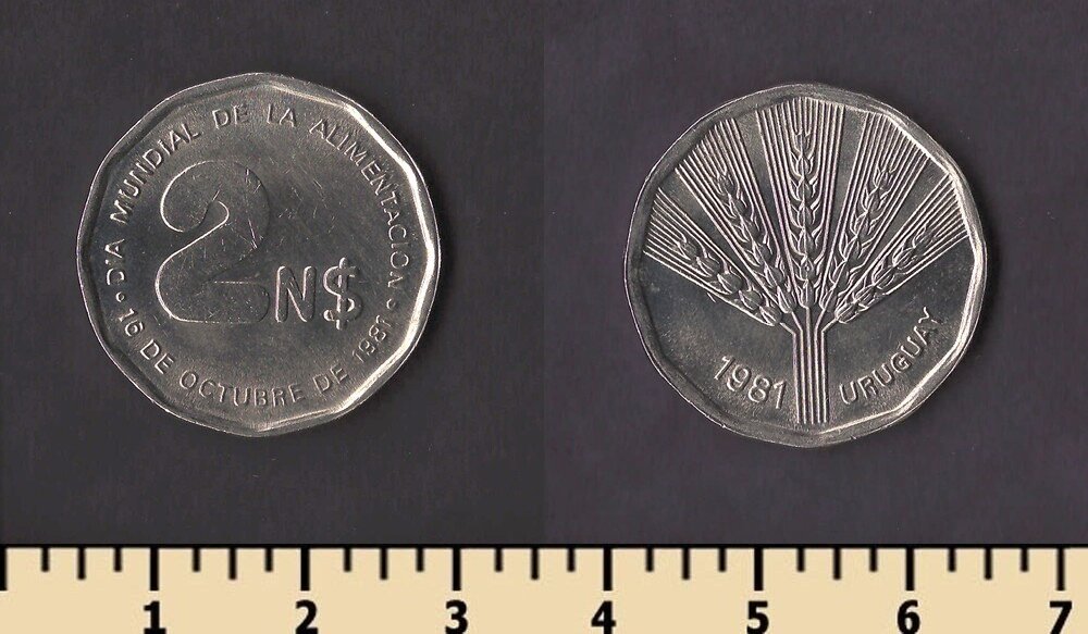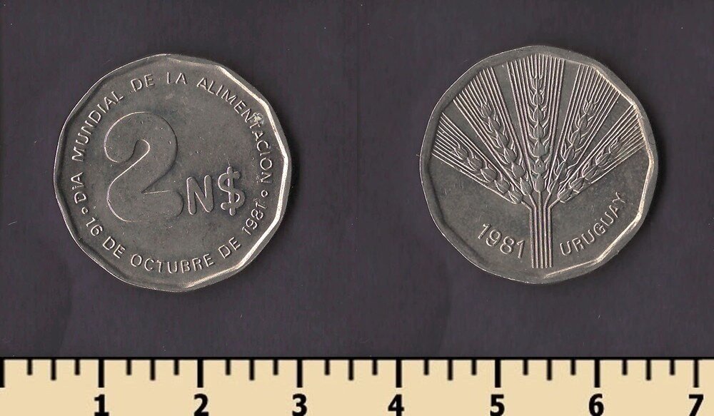 Примечание: эти монеты были отчеканены в1969 году на монетном дворе вСантьяго (So) , Чили для Уругвая