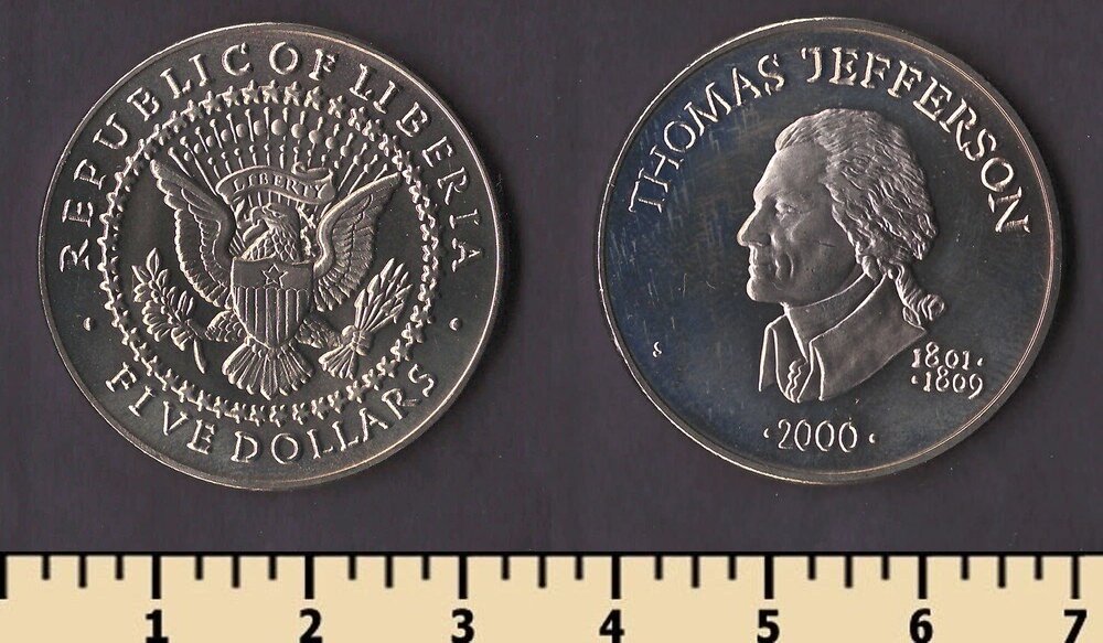 Состояние: на скане.Номер по каталогу Краузе: KM#840 Тираж: Материал: медно-никелевый сплав Вес: 11,22 гр Диаметр: 31,5 мм Тип гурта: рубчатый Примечание: Описание: Томас Джефферсон