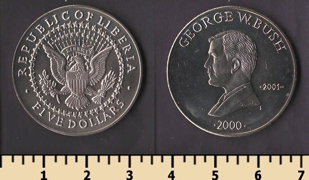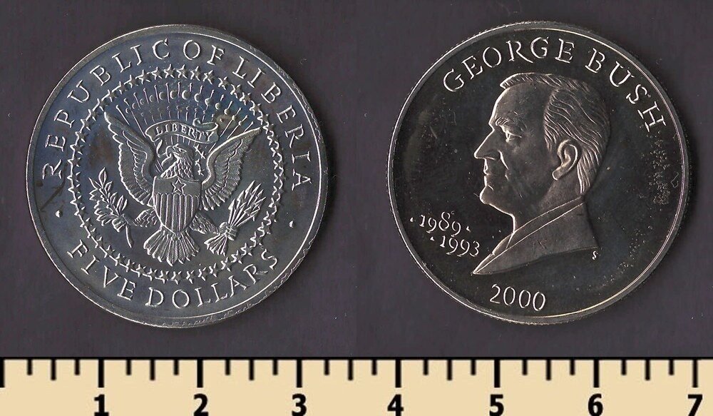 Состояние: на скане. Номер по каталогу Краузе: KM#949 Тираж: Материал: медно-никелевый сплав Вес: 11,22 гр Диаметр: 31,5 мм Тип гурта: рубчатый Примечание: Описание: Джордж Буш