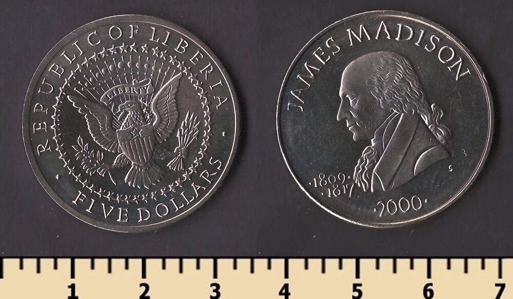 Состояние: на скане.Номер по каталогу Краузе:KM#913 Тираж: Материал: медно-никелевый сплав Вес: 11,22 гр Диаметр: 31,5 мм Тип гурта: рубчатый Примечание: Описание: Джеймс Мэдисон