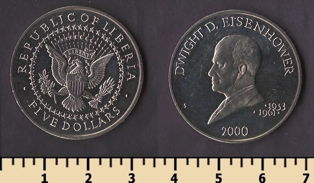 Состояние: на скане Номер по каталогу Краузе: KM#942 Тираж: Материал: медно-никелевый сплав Вес: 11,22 гр Диаметр: 31,5 мм Тип гурта: рубчатый Примечание: Описание: Дуайт Эйзенхауэр