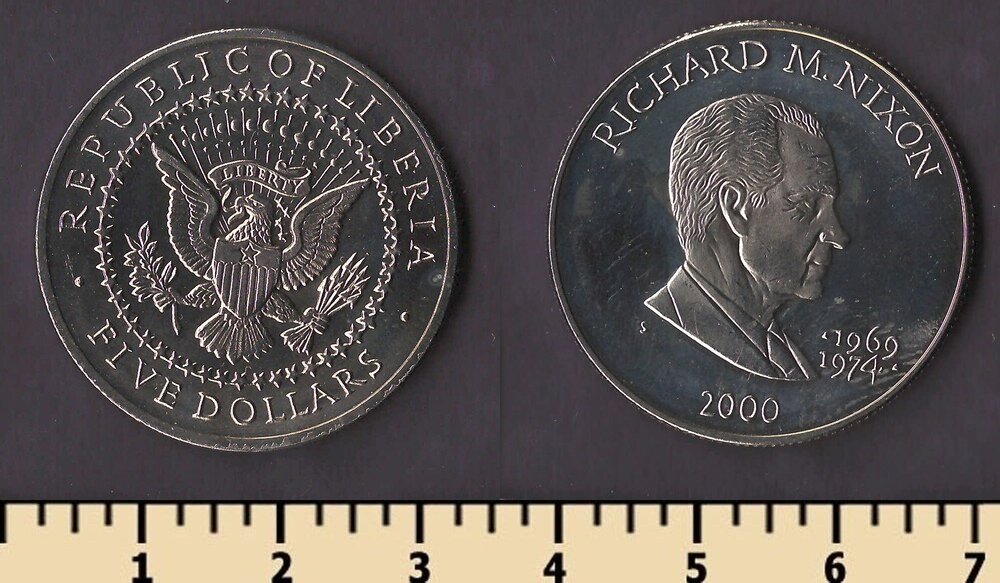 Состояние: на скане Номер по каталогу Краузе: KM#945 Тираж: Материал: медно-никелевый сплав Вес: 11.22 гр Диаметр: 31.5 мм Тип гурта: рубчатый Примечание: Описание: Ричард Никсон