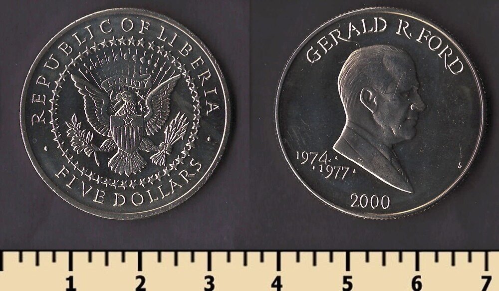 Состояние: на скане Номер по каталогу Краузе: KM#946 Тираж: Материал: медно-никелевый сплав Вес: 11.22 гр Диаметр: 31.5 мм Тип гурта: рубчатый Примечание: Описание: Джеральд Форд
