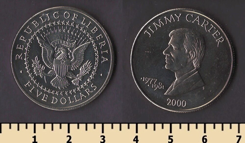 Состояние: на скане Номер по каталогу Краузе: KM#947 Тираж: Материал: медно-никелевый сплав Вес: 11.22 гр Диаметр: 31.5 мм Тип гурта: рубчатый Примечание: Описание: Джимми Картер