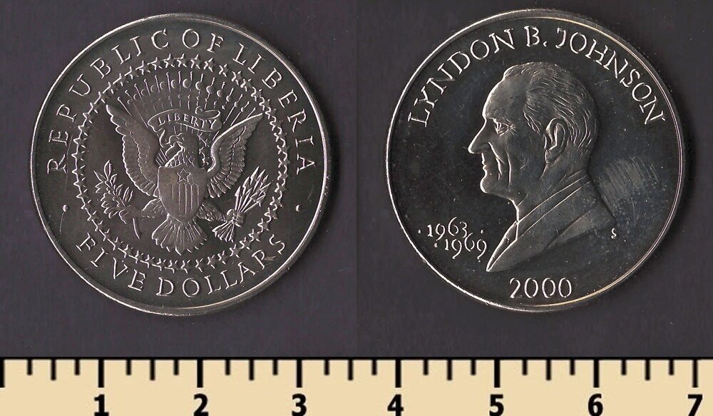 Состояние: на скане Номер по каталогу Краузе: KM#944 Тираж: Материал: медно-никелевый сплав Вес: 11.22 гр Диаметр: 31.5 мм Тип гурта: рубчатый Примечание: Описание:Линдон Джонсон
