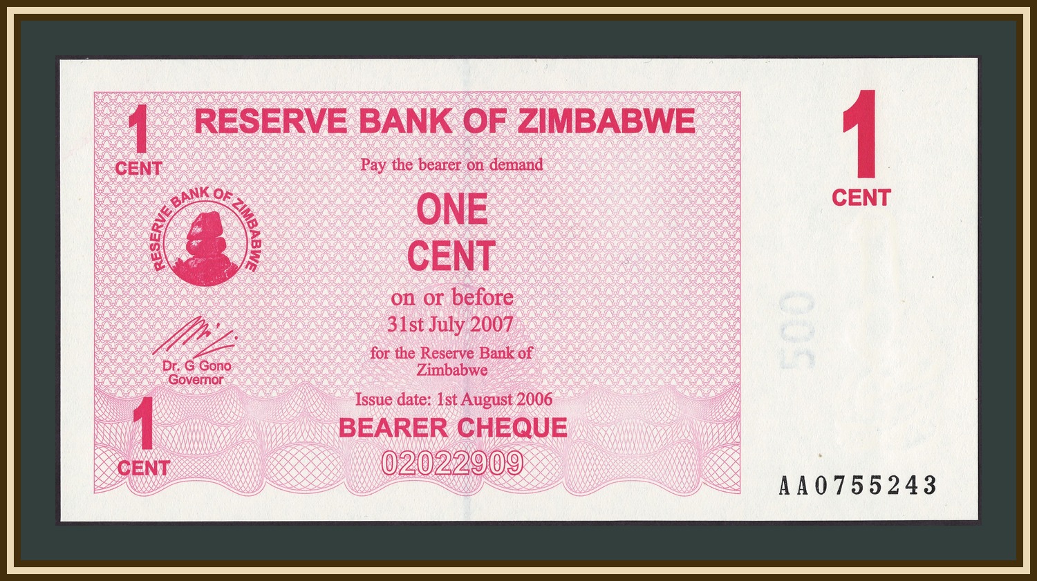 Принтер: Лояльные типографии и нефтепереработчики Хараре (Зимбабве) - FPR Номинальная стоимость: 1 Зимбабвийский цент